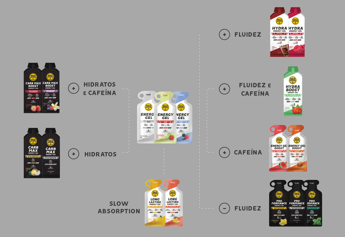 La gama de geles deportivos GoldNutrition está diseñada para diferentes necesidades. Por lo tanto, varían en cuanto a: